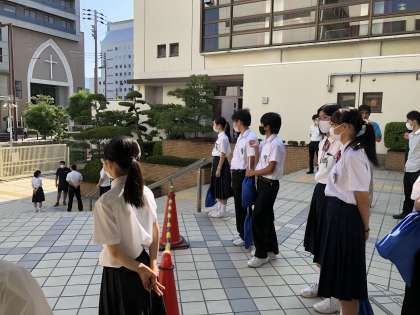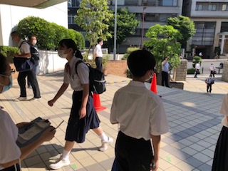8時10分から、玄関であいさつを交わしています。1年生は、今日は学年集会もあるので、教室での準備がスムーズにできるよう早くから登校していました。