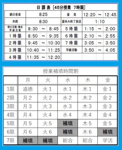 さて、明日、6月27日は土曜授業を行います。45分の授業を4コマ行いますので、下校時刻は12時35分〜50分頃となります(授業参観は行いません)。