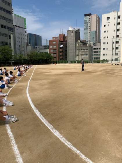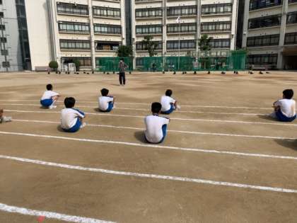 2年生5組の体育の授業は、グラウンドで50m走の計測を行いました。