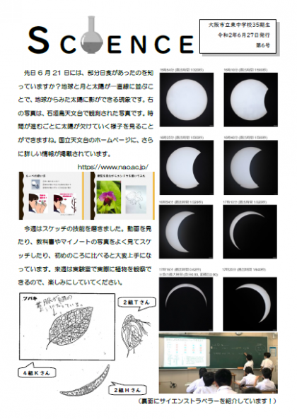 「理科通信Science6」を発行しました。紙面では「部分日食の様子」などが紹介されています。また、生徒のスケッチも紹介されています(こちらをクリックすれば、カラーでご覧いただけます)。