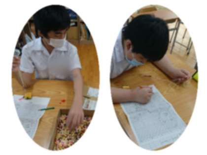 配色図案を見ながら、ビーズを1個ずつ糸に通していきます。指先の細かな作業なので、集中して取り組むことがポイントです!