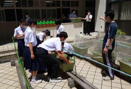 2年生の栽培実習では、技術室前の三角スペースを利用して「大阪しろな」を栽培します。