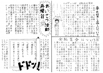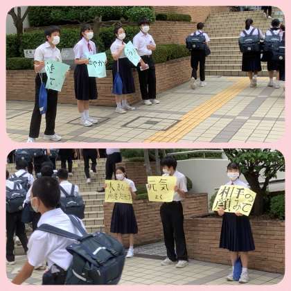 生徒会役員は、「元気よく」「相手の顔見て」「爽やかに」「心を込めて」などのポスターを手に正門で率先垂範して挨拶活動をしています。