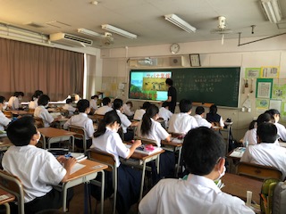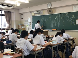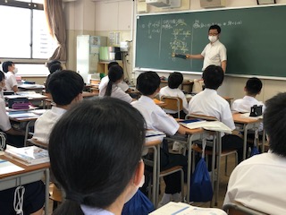 数学では因数分解、社会では世界の気候、国語では「クジラの飲み水」を学習しています。どの授業も集中して、しっかりノートを取っています。