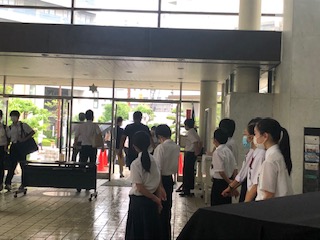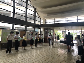雨が降っているため、玄関ホールであいさつ運動を行いました。