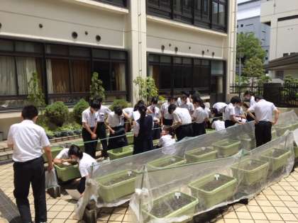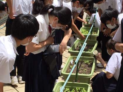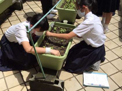 技術家庭科(技術分野)では大阪シロナの栽培をしています。今日のクラスは11日目で、追肥や間引きを行いました。