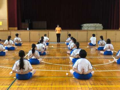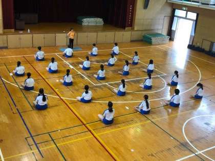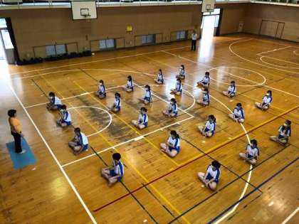 体育館ではヨガが行われています。初めて体験する生徒が多く、興味津々です。柔軟性が高い生徒が多く驚きです。