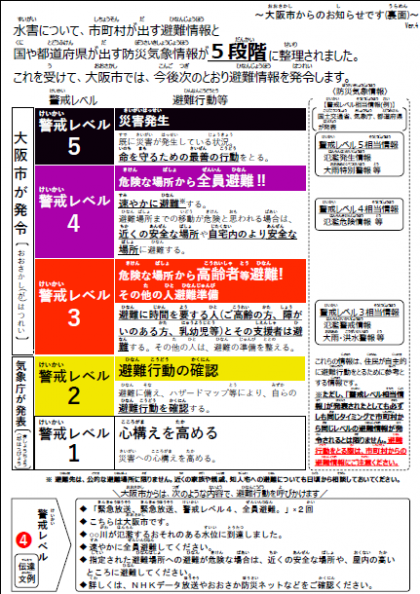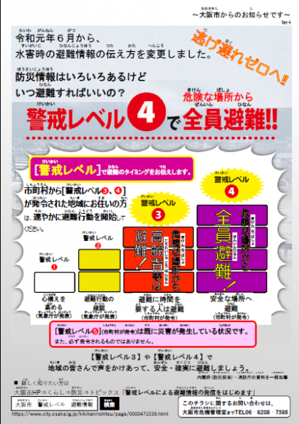 全国各地で大雨や洪水等により甚大な被害が発生しております。大阪市では、これまでもお知らせしていますように、令和元年6月より水害時の避難情報の伝え方が「避難準備・高齢者等避難開始」等から「警戒レベル3」等に変更となりました。