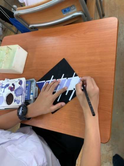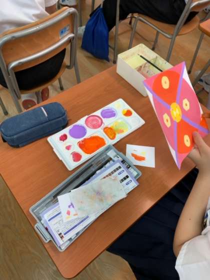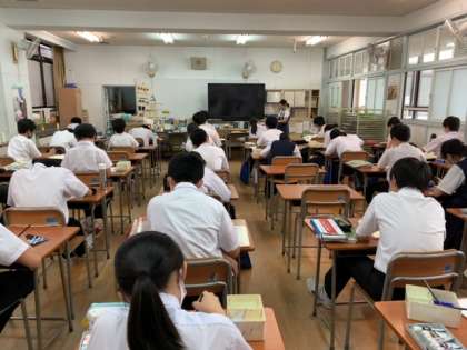 2年3組の授業は形と色で構成しよう!の作品作りと、選挙のポスターについて考えています。