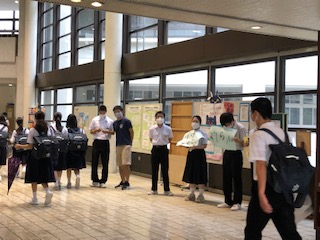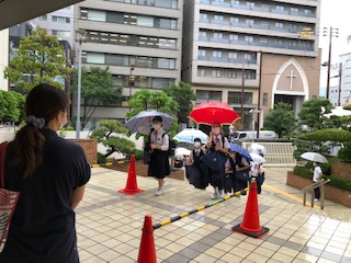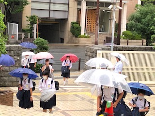 今日も雨です。屋根の下、玄関ホールで挨拶運動が行われています。