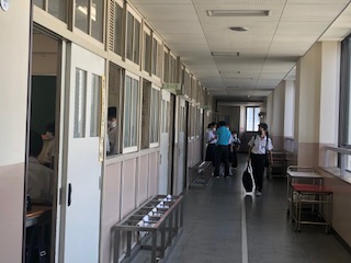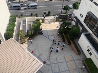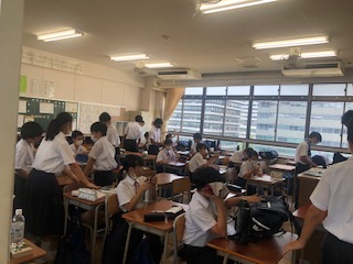 朝の教室はとても暑いです。登校したらまず手を洗って、タオルで汗を拭いています。
