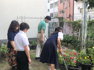 庭の花壇を整備して、花に水をやりました。夏野菜の苗も植えています。大きく成長してほしいですね。