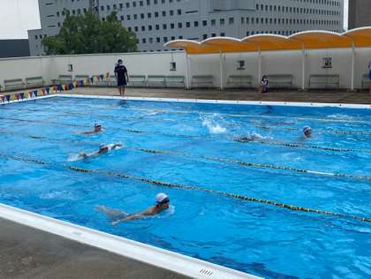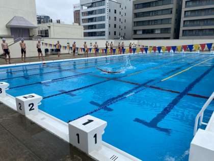 水泳部の見本をしっかりみて、キックの練習をした後、25mをバタフライで泳いでいます。