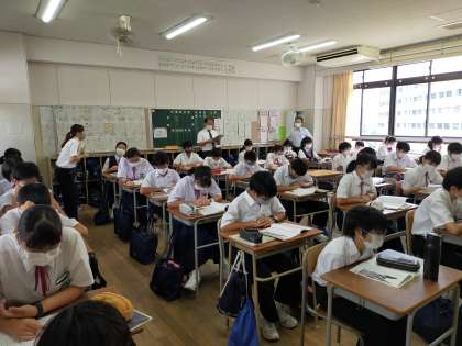 本日1限目、1年3組では担任の楠田先生による道徳研究授業が行われました。楠田先生から話があったことに対し、積極的に発言したり、真剣に考えたりと一所懸命に取り組んでいます。