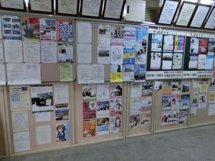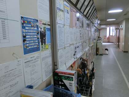 3階に引き続きここは1階職員室前、ここにもびっしりと各高校案内が、3年だけでなく1・2年生も早くから、進路に目が向くようまた、来校された保護者の方々も閲覧できるようびっしりと張られています。