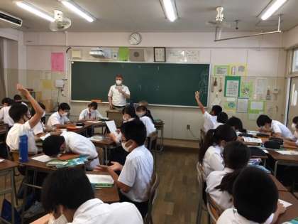 生徒たちは、C−NETのブライアン先生と一緒に、一般動詞を使った英文のゲームを楽しんでいます。