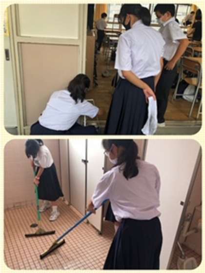 汗をいっぱいかきながら、一生懸命に掃除しました。1学期、お世話になった教室やトイレに「ありがとう」の気持ちです。