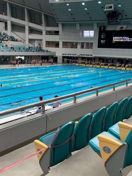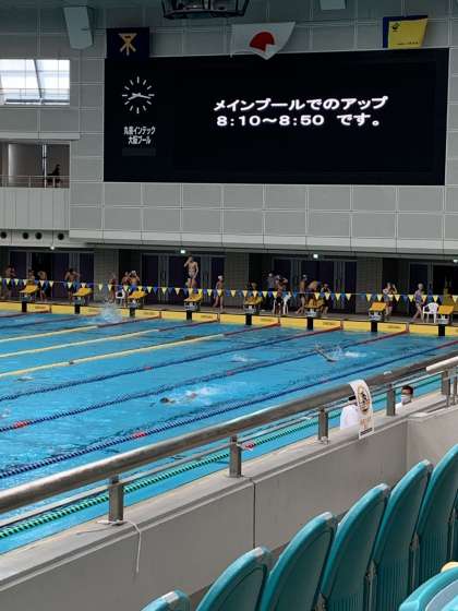 大阪プールでの大会は最終日。ウォーミングアップが始まりました。最終日という事で入念に感覚を確かめながらアップを行っています。この大会で50mプールでの試合が最後になる生徒も多いので、他校の生徒も気合いが入っているようです。