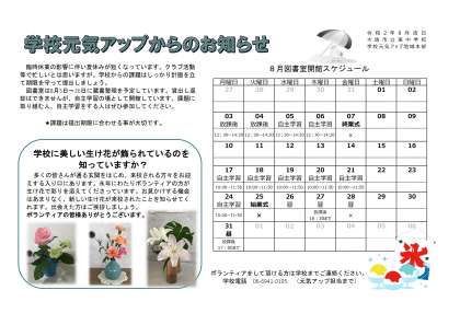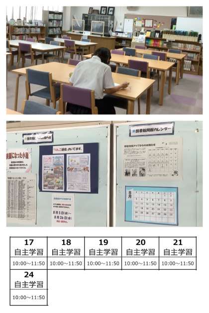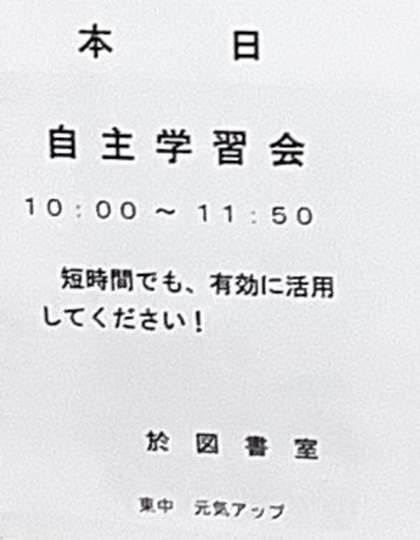 今日から6日間、学校元気アップコーディネーターの方々により、自主学習のために開館しています。朝、10時から約2時間の開館です。短時間の参加もOKです。図書館を有効に活用しましょう!