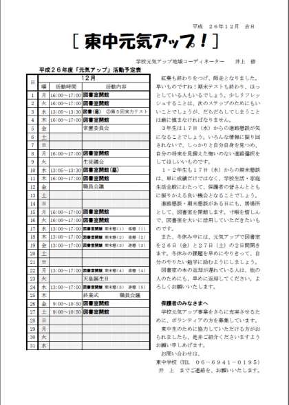 トップページ右側の「配布文書」−「学校元気アップ活動予定表」に掲載しました。