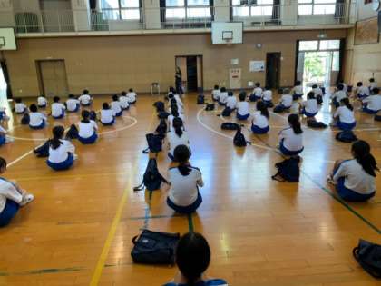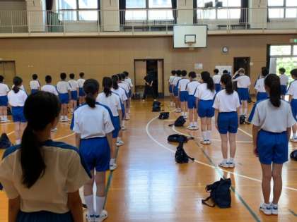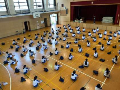 1年生3・4組の体育の授業では、体育大会に向けて集団行動を行いました。