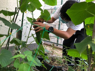 2枚目はきゅうりの収穫の様子です。まだ小さい果実がどんどん増えています。これからが楽しみですね。