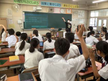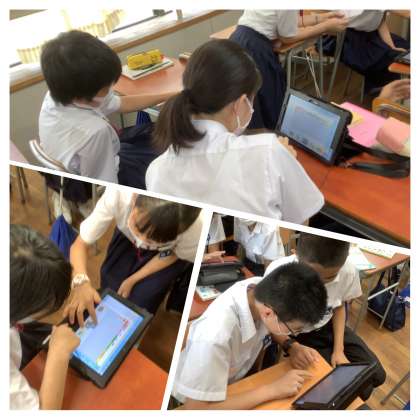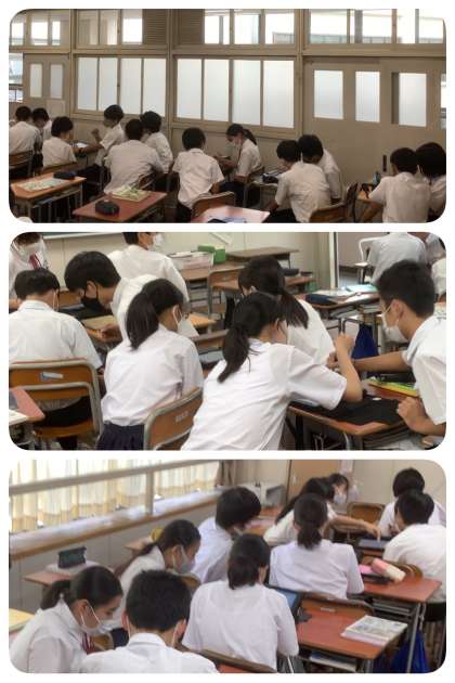 2年生の家庭科の授業では「健康と食生活」の学習が、タブレットなどのICT機器も活用しながらテンポよく進められています。また、2人1組の作業学習では、3密にならないように注意し、最後には1台づつ消毒してから片付けています。