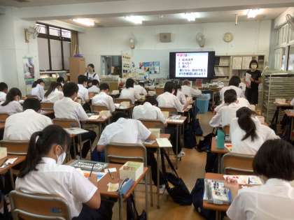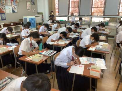 1年生の美術の授業は「気持ちを色にのせて♪」の作品作り。平塗りのポイントは「はみ出ず」「むらなく」「美しく」。生徒たちは、自分の気持ちを色とデザインに込め、集中して作品作りに取り組んでいます。