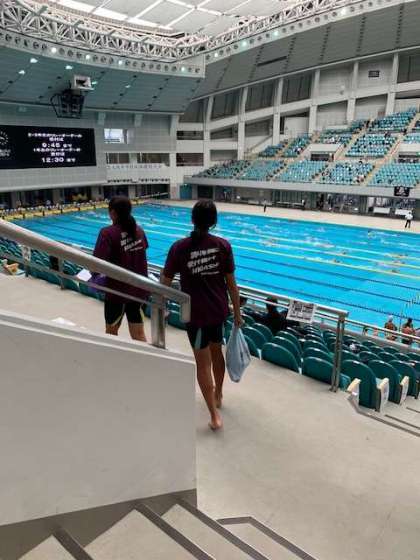 大阪府の水泳競技大会の2日目。ウォーミングアップが始まりました。