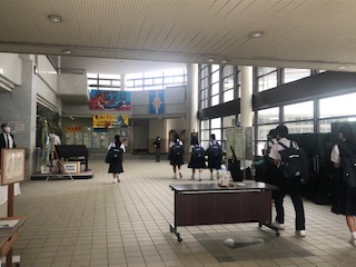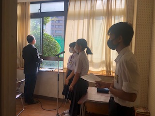 今日は全校集会で「元気よく挨拶すること」をひとつのテーマに、3年生代表生徒と校長先生からお話がありました。