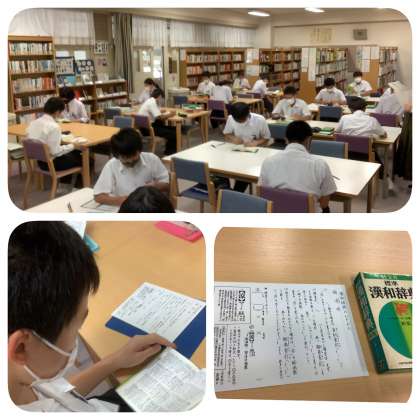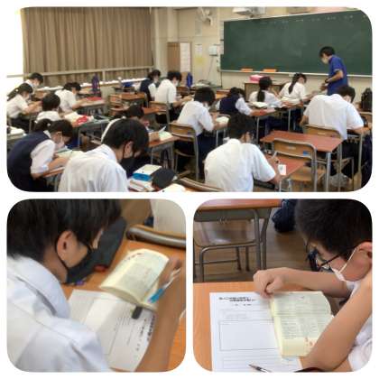 教室では「国語辞典」を使いながら「新しい言葉と出会い、言語感覚を磨こう」をテーマにした授業。一方、図書館では「漢和辞典」を使い、辞典のひきかたを学習した後は、難しい漢字の「早引き」大会。少人数ならではの、きめ細やかな授業が進められています。