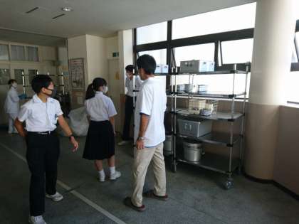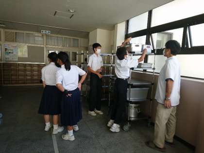 給食当番は、2階の配膳室前まで食器や食缶を返却します。2階までの移動には階段を使用するため、気をつけて運びましょう。
