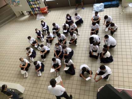 昼休みに多目的ホールで各クラスの応援団長・副団長が一堂に会し、打ち合わせを行いました。学級旗をはじめ、応援グッズ、当日のまとまりなどで応援賞が審査されます。様々な制限がありますが、団長・副団長を中心に、思い出に残る、そして、記憶に残る体育大会にしていきましょう。