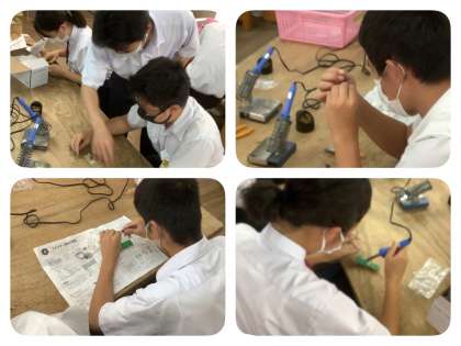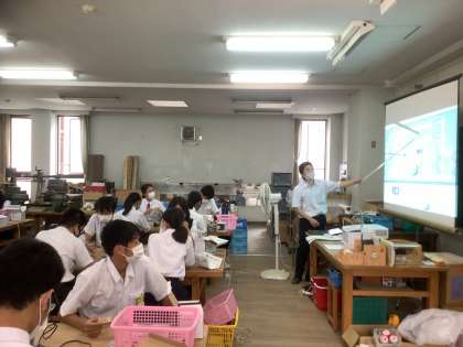3年生の技術の時間では「エネルギー変換の技術」の学習。作業キットを使っての実習もあり、内容が盛り沢山の授業が展開されます。身の回りにあるエネルギー変換の技術について、また、直流と交流、コンバーターとインバーターなどについての理解が深まります。
