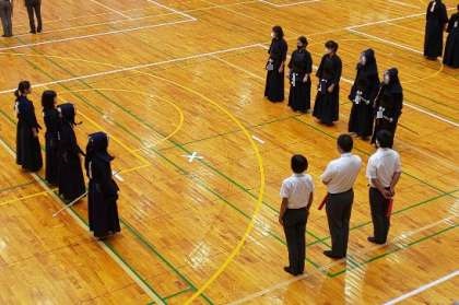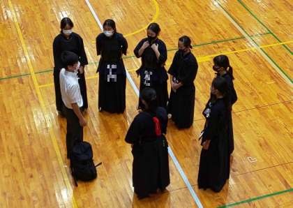東中剣道部女子は開会式直後の第1試合です。ミィーティングで士気を高めて試合に臨みます。