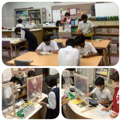 お弁当をいただいて、ほっと一息の昼休み。元気アップのスタッフの方々のおかげで開館されている図書館で静かに読書に勤しむ生徒の姿がありました。今年の秋の読書週間のスローガンは「ラストページまで駆け抜けて」。