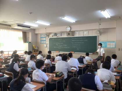 各学年の英語の授業の様子です。1年生は、複数の教員によるティーム・ティーチング。2年生は、英作文にチャレンジ、3年生は、CーNETの先生とアクティビティを取り入れた学習をしています。延期された体育大会の前日ですが、落ち着いて授業に挑んでいます。