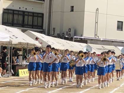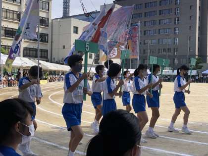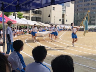 全員が見守る中、旗とプラカードを持って入場行進です。放送委員から各クラスの紹介がされました。
