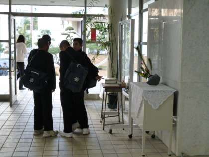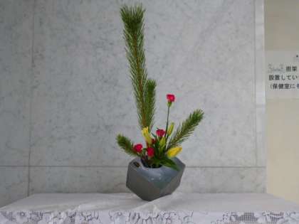 東中百景生け花シリーズです。お馴染み、学校支援ボランティアの中村様が、始業式に合わせて1月7日に生けてくれました。今回のテーマは「初春」です。若松、ユリ、カーネーションのコラボレーションで、変形花器に生けておられます。今回の生け花は、凛とした空気が玄関ホールに漂います。