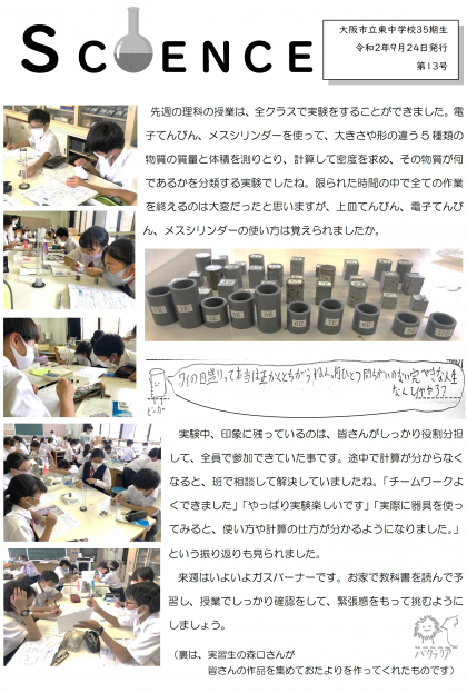 Science13号では、以下のように実験の様子が記載されています。裏面では、教育実習生と取り組んだ課題のまとめが紹介されています。