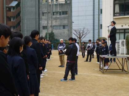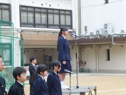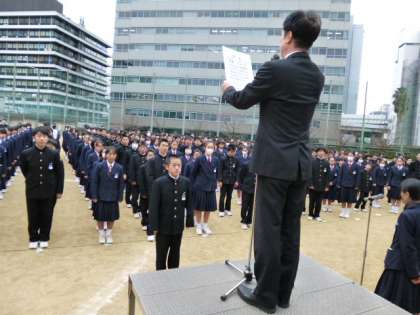 今日は朝から分厚い雲が太陽を隠し、とても寒く感じる朝を迎えました。そんな中、3学期最初の全校集会が行われました。