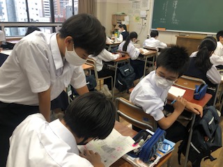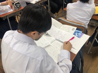 テストのために、最後の見直しを行っています。友だち同士で確認しあい、準備万端です。