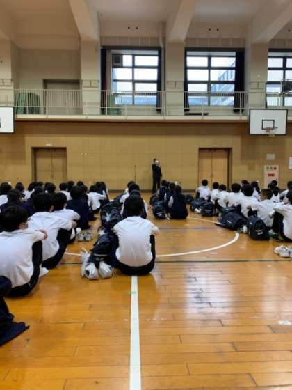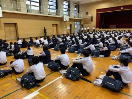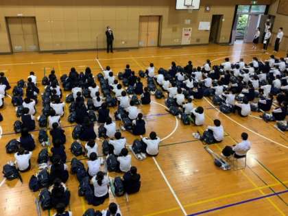 中間テスト終了後、体育館では部活動集会が3年生の部活動部長会議のメンバー主催で、実施されています。