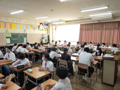 学級目標を基盤としての班目標の決定、どんな班にしたいか、について各学級各班で話し合っています。この後は各班の代表生徒による話し合ったことの報告です。