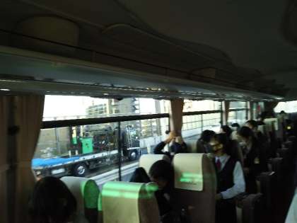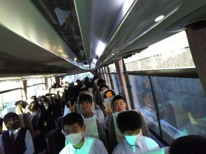 バス内はレク係が作成した音楽が流れ賑やかです。