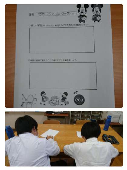 某テーマパークの清掃員についての読み物資料をつかって学習しています。