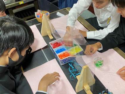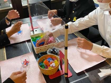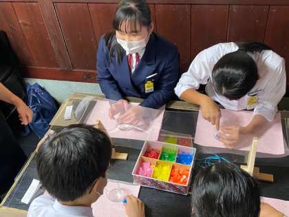 モザイクキャンドルの体験が始まりました。カラフルなロウを選んでいます。