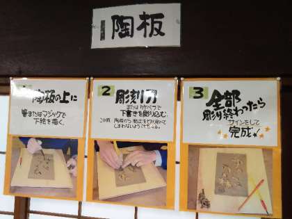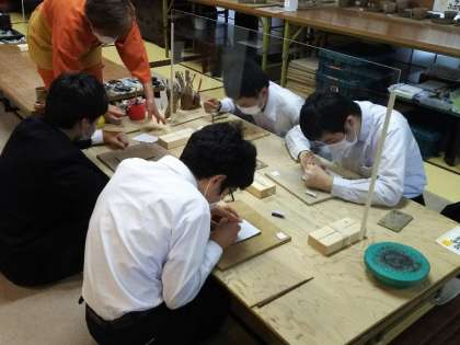 4名の生徒が陶板作りの体験を行っています。