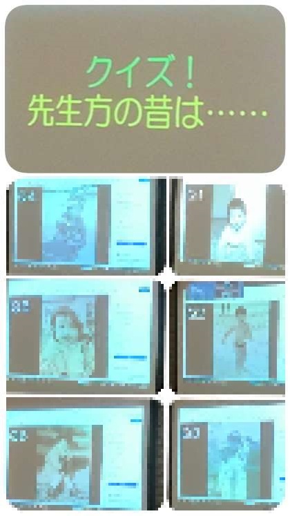 レクレーションの最後にスペシャルクイズ!!3年生ゆかりの先生方の写真が、スクリーンに映し出されました。12人の先生方、写真の提供ありがとうございました。