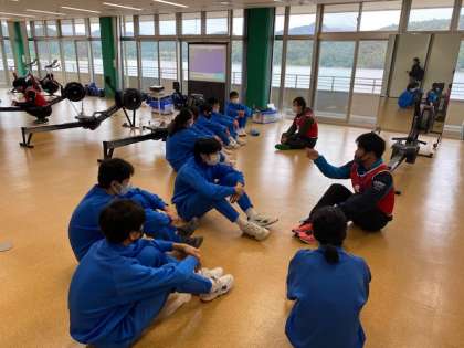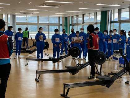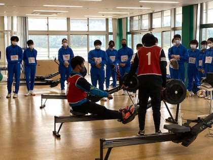 ボート体験は強風のため、エルゴマシーンという陸上でボート漕ぎのトレーニング体験ができる器具を使った体験に変更になりました。